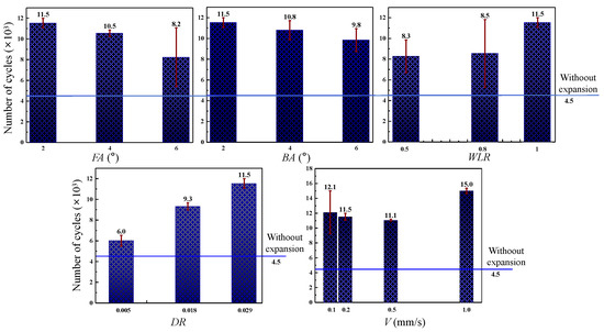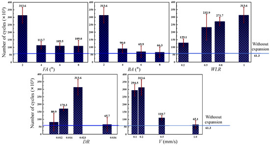 The influences of the significant DMCE parameters on the fatigue lifetimes of Al and Ti two-hole-involved specimens after expansion are shown in Figure 13 and Figure 14, respectively; the fatigue lifetimes of both Al and Ti alloys were improved. As shown in Figure 13, with the increase in the front cone angle, back cone angle and expansion segment length, the fatigue lifetimes of the two-hole-involved Al and Ti alloys, respectively, decrease, and decrease and increase, which is consistent with the varying tendencies of those parameters on the mean tangential residual stress of hole wall after expansion. This is because the increased compressive residual stress is able to contract larger tension stress, which restrains the degree of stress concentration and hinders crack initiation, and in turn, improves the fatigue lifetime of specimens. Regarding the interference magnitude, the fatigue life of the Al specimen continuously increases, and the fatigue life of the Ti specimen first increases and then decreases due to the appearance of surface chipping. It is believed that there is also an inflection point of interference magnitude for Al alloys. However, with the increase in extrusion velocity, the fatigue life of the Al specimen first decreases then increases and achieves the maximum value when the extrusion velocity equals 1 mm/s; the fatigue life of the Ti specimen first increases then decreases and achieves the maximum value when the extrusion velocity equals 0.2 mm/s, which is originated from the coupling effect of residual stress, plastic deformation and surface quality.