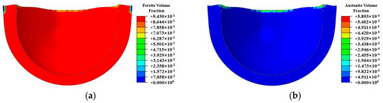 However, during the cooling process, the residual stress in components undergoes significant changes, and monitoring of this residual stress can only be conducted in the post-cooling state. Therefore, it is essential to investigate the mechanism of stress evolution during the cooling process following thermal forging and stamping of spherical shells. Traditional finite element simulation methods are limited to reflecting material sensitivity to temperature within the range of thermal expansion and contraction; they fail to reveal the importance of microstructural phase change on stress behavior [14]. Consequently, based on phase transformation theory, it is necessary to consider phase transformation kinetics during cooling. By calculating the volume fractions of various phases at different temporal and spatial states, we can convert macroscopic thermodynamic properties into a product of thermodynamic properties associated with each phase’s organization and its corresponding volume fraction, thereby aligning with actual physical laws. Zhu et al. examined the effects of phase transformation plasticity and martensitic expansion in their study on austenitization dynamics during quenching processes for high-strength steel [15]. Zhong et al. established a coupling model involving phase transformations as well as temperature and stress–strain relationships within 42CrMo steel; they quantitatively analyzed phenomena such as phase transitions, latent heat release, and plasticity occurring during quenching through experimental validation to predict relevant material properties [16]. Furthermore, Wang et al. formulated kinetic equations addressing martensite decomposition alongside residual austenite during tempering processes for Mn-Mo-Ni steels [17]. Li et al. conducted multi-field coupling simulations regarding temperature–structure–performance interactions throughout heat treatment processes (quenching) for SA508Gr.3 steel forgings while optimizing heating protocols [18]. Based on current research findings by scholars in this field, incorporating phase transition theory into thermodynamic simulations effectively elucidates how temperature influences residual stress evolution patterns.
