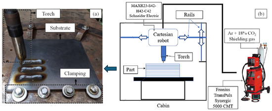 Figure 1a illustrates the system with the substrate in which the walls were deposited and the torch, with the use of clamps being crucial to ensure adequate stabilization of the substrate on the worktable. Figure 1b represents the complete deposition system, highlighting the robot’s Human-Machine Interface (HMI), used to input G-code and adjust torch displacement parameters, while the power source’s HMI allows adjustment of voltage, current, and other essential process parameters.