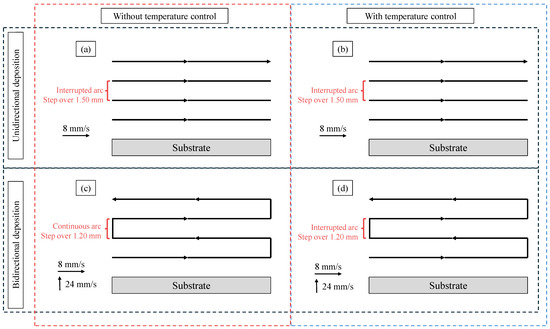 Therefore, the first wall, similar to Soares et al. [14], was composed of 26 layers and used a unidirectional deposition strategy without temperature control. In the second wall, also with 26 layers, the interlayer temperature control of 60 °C was applied combined with unidirectional deposition direction. The third wall followed a bidirectional deposition strategy with 30 layers and no temperature control. Finally, aiming to improve the wall quality, the fourth wall, with 25 layers, combined the bidirectional deposition strategy with temperature control at 60 °C. Figure 2a–d illustrates the strategies adopted, the length, the pitch and the torch travel speeds (TTS) used in the different methods described for the four deposition walls mentioned above, the black arrows represent the torch path. The parameters adopted for wall deposition, according to the deposition method presented in Figure 2, are shown in Table 1. It is important to highlight that the step over and the TTS were programed into the code and that the robot possesses axis accuracy of 0.05 mm in the vertical direction and 0.1 mm in other directions.