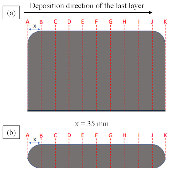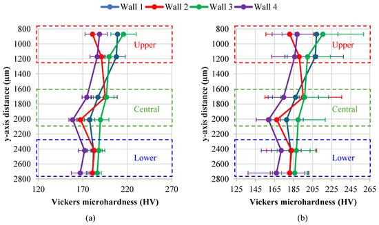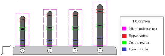 The vertical (column) analysis was performed by considering the average of the vertically aligned microhardness measurements belonging to each column. For each x value, two indentations were performed per region, totaling six indentations along the different regions. Thus, this approach aims to map the microhardness values along the x-axis, throughout the thickness of the walls, covering both the regions adjacent to the walls and the central regions of the walls, as graphically represented in Figure 13.