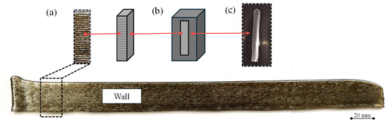 Scheme of the sample preparation for microhardness measurements: (a) Extracted wall, (b) cold-mounted wall section and (c) mounted wall section after sanding.