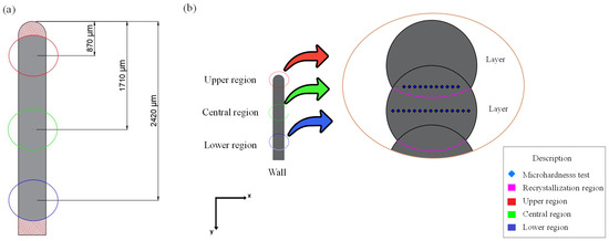 The Vickers microhardness test was conducted using the DuraScan equipment from EMCO TEST, using a pyramidal indenter and an angle between faces of 136°. The applied load was 0.5 kgf and lasted seven seconds. During the test, 10× and 40× magnification lenses were used to quantify microhardness. The indentation impressions on the walls were made in three distinct regions: upper, central and lower, as illustrated in Figure 5a. In each region, two sets of impressions were made, one between the layers and another in the center of the layer. This method was selected to evaluate the microhardness variation throughout the wall without measuring it at the entire surface, which would be very time-consuming. The results obtained were analyzed with confidence intervals of 68% and 99.7%, ensuring a robust and reliable evaluation of the microhardness measurements. The indentations were made by taking the top of wall 4 as a reference because this wall has the greatest height. Thus, the upper region is located 870 μm from the top, the central region is located 1710 μm from the top and the lower region is 2420 μm from the top. Figure 5b shows the positions of these regions.