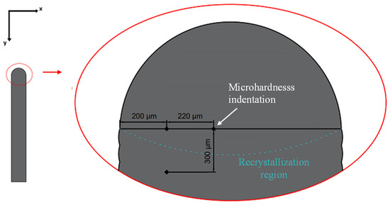 Scheme of the microhardness measurements: (a) dimensions indicating the three evaluation regions and (b) detail of microhardness indentation regions.