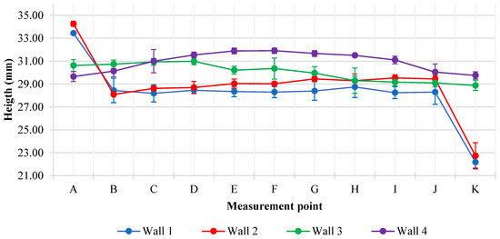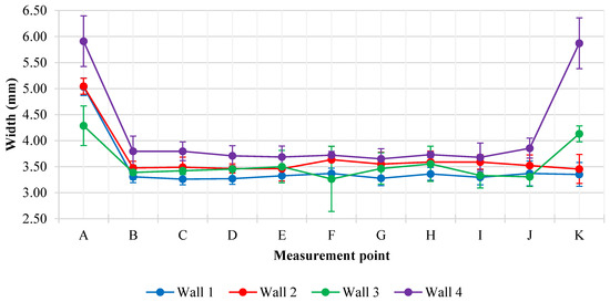 Figure 9 shows the comparison graph of wall widths. Wall 1 presented the smallest width, with the highest value at the initial part (measurement point A) due to the lateral flow of the material until the arc stabilized. Wall 2, with temperature control, resulted in an average increase in width of 5.39% compared to wall 1, reflecting the greater lateral dispersion of the material. For wall 3, the bidirectional movement resulted in a uniform width at the central points (measurement points B–J), possibly due to the slightly lower exposure to the arc in these regions, and a slight increase at the end (point K). Finally, wall 4, with bidirectional deposition and temperature control, obtained the largest average width, approximately 26.14% greater than wall 1. Similarly, Zhang et al. [18] also observed a great impact of the heat input on the layer height in their work, evaluating the WAAM deposition of In 625, the layer height varied from approximately 1.75 mm to 3.00 mm when the heat input was reduced from 828 J/mm to 276 J/mm, reinforcing the importance of controlling the heat to achieve the desired geometry.