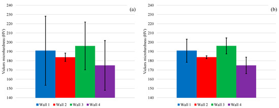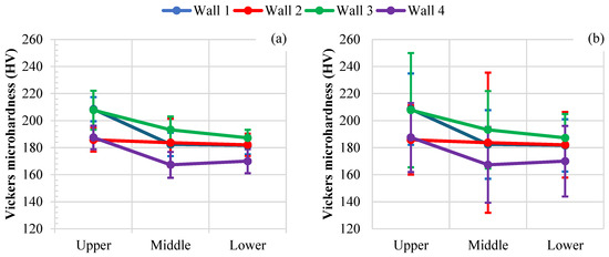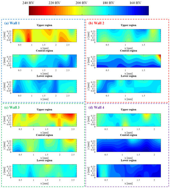 To better represent the overall microhardness variation within the wall, Figure 15 contains the microhardness mapping for all the deposition conditions evaluated. As mentioned, in item 3.2.3, it is expected that the walls present a slightly higher hardness on the upper region due to the heat accumulated during the deposition. This behavior can be noticed in Figure 15, especially for wall 1 and wall 3, Figure 15a,c, respectively. Additionally, it can be noticed that using temperature control (wall 2 and 4), the variation in microhardness is higher for the central region, while walls 1 and 3 (no temperature control) presented higher variation at the upper region. This can be attributed to the higher heat accumulation in the upper region, as previously discussed.