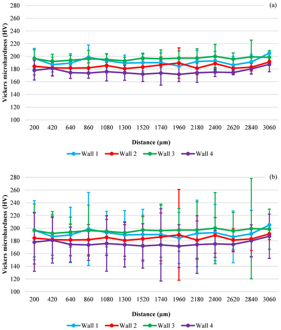 The line analysis of the walls shows significant variations in the microhardness values along the height, highlighting the impact of the deposition and thermal control strategies. As illustrated in Figure 14, wall 3, which used bidirectional deposition without interlayer temperature control, presented the highest microhardness values, with an increase of 12.18% in relation to wall 4, which obtained the lowest values. Between walls 1 and 2, wall 1 showed microhardness values 4.24% higher, suggesting that thermal control reduces hardness by modifying the secondary phases, as pointed out by Zhang et al. [13].