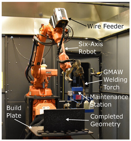 The canonical wire arc additive manufacturing process builds on the well-established principles of manual welding and shares process fundamentals with widely deployed robotic welding equipment. However, unlike the former processes, WAAM is able to generate complex metallic geometries in multiple dimensions composed of many individual weld beads [13]. The typical components found in a WAAM production cell are illustrated in Figure 1. The WAAM process consists of the deposition of independently welded beads deposited in sequence according to the generated toolpaths. The welding process generates an electric arc between an electrode and the substrate, which generates high heat and ionizes the inert shielding gas to generate plasma. The generated heat creates a pool of molten metal in the substrate, and wire is fed into the melt pool to generate a weld bead. Before the deposition of each bead, inert welding gas is purged for 1–2 s before an arc is struck to ensure complete coverage of the weld. A similar purge occurs after the welding arc is extinguished. The mixture of gas utilized for WAAM is a key factor in achieving a strong weld and quality surface finish [14]. After a welding bead has been completed, the welding torch may undergo multiple types of routine maintenance, including anti-spatter spraying, torch reaming, wire cuts, and contact tip replacement. The anti-spatter spray and reaming prevent welding spatter from building up on the nozzle, while wire cuts between deposited beads improve the surface finish of the part. For deposition with gas metal arc welding (GMAW), the welding contact tip also wears out after a certain weld duration and must be replaced before the process can continue. While plasma arc welding (PAW) and gas tungsten arc welding (GTAW) are also used for WAAM deposition, the GMAW process is most widely adopted and was the primary process used to develop the solutions within this work. However, many of the outlined considerations and solutions are still relevant to WAAM deposition with other welding processes.
