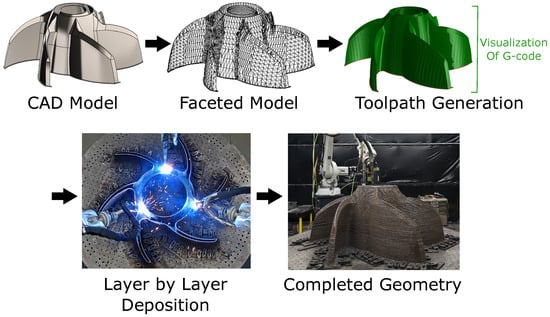However, this WAAM technology is limited without a suitable strategy for the generation of toolpaths that ensures completed components are accurately deposited and fully dense. Many WAAM researchers are still heavily dependent on commercial CNC software, manually coded toolpaths, or modifications of slicing software intended for fused deposition modeling (FDM) to generate WAAM geometries [4,5,6,7,8]. Manually coded toolpaths can incorporate WAAM considerations, but they are cumbersome to generate and only suited to simple geometries. Conversely, existing CNC toolpathing or FDM slicing packages handle complex geometries, but they lack the settings to account for the arc welding process. There are a multitude of considerations for WAAM to achieve a high-quality deposition which do not exist in polymer or other metallic manufacturing methods. As an example, most thermoplastics have low melting temperatures, around 105 °C, while mild steel requires temperatures of ≈1350 °C or more to flow. Especially for complex geometries, the existing slicing tools often produce poor toolpaths for WAAM systems and fail to account for the intrinsic features of the welding process.