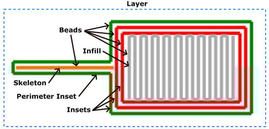 After the bounding polygon(s) have been created for each layer, the next step is the generation of layer toolpaths. Toolpaths are usually generated starting with the outside perimeter and working towards the center to ensure dimensional accuracy, but this may vary according to the geometrical requirements of a particular part. In this method, a perimeter bead which traces the bounding polygon is the first deposited bead in a layer. The toolpath for this bead is determined by offsetting the bounding polygon inward by half of a bead width to locate the center line [17]. The bead width is the nominal width of a single bead of deposited material. Parts can contain multiple bead widths corresponding to different process parameters. If any regions are generated where the offset polygon for the perimeter bead intersects with the bounding polygon to create a negative area between contours, these regions are deemed too small to generate a toolpath and eliminated. From here, the slicing software must decide how to fill the remaining area within the bounds of the perimeter bead. Within the slicing paradigm presented in this work, there are three fundamental bead types (as shown in Figure 3), which the slicing process employs to fill the remaining area: insets, skeletons, and infills. Each of these beads serves a particular function in ensuring that layers in the completed part are appropriately flat and without voids.