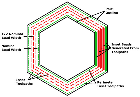 Inset beads are the primary building blocks of most WAAM parts. These beads are always printed in closed loops to maximize part strength and are constructed as shown in Figure 4. The perimeter toolpath(s) can also be referred to as perimeter inset(s) as the remaining insets are constructed as offsets from these initial beads. These perimeter inset(s) form the visible exterior surface of the completed part. The perimeter inset(s) are generated by offsetting the part outline by 1/2 the nominal bead width. From here, the remaining inset beads are generated by marching inwards from the perimeter beads with interior insets being offset from an adjacent inset by the nominal bead width.