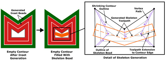 The skeletonization process is used to fill any small gaps between insets. These skeleton beads are open-loop paths that cover the remaining area where geometric restrictions will not allow for the generation of a closed-loop inset [18]. Skeletons follow the part curvature and, in most cases, will not be generated adjacent to another skeleton. Skeletons are critical to ensuring that all sections within a layer are deposited uniformly to form a fully dense geometry. They fill small internal areas within a layer, which would create voids if additional beads were not added. This is critical to the success of future layers as the existing WAAM process is unable to bridge large gaps while maintaining the arc.