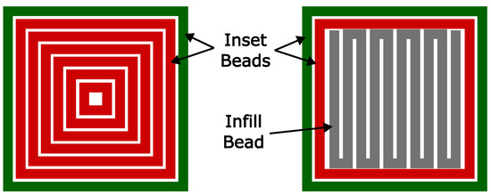 As previously defined, insets are closed-loop beads which define the boundaries of a part and can sometimes compose all toolpaths within a layer. However, the closed-loop nature creates a geometrical limitation on insets as the maximum bead length is fixed by the length of the inset contour. In many cases, maintenance must be performed on the welding torch, and the robot must perform travel moves before depositing consecutive beads, which affects overall productivity. This means a layer composed of concentric insets will take considerably longer to print and undergo more thermal cycling compared to an equivalent layer filled with an infill pattern. Additionally, since the welding process is not continuous, each inset bead will experience the transient effects that occur when stopping and starting the weld. These transient effects result in less consistent bead geometry throughout a layer composed mostly of insets.