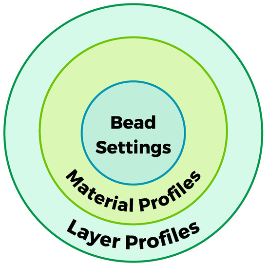 The bead hierarchy implemented within the slicing process consisting of a selected layer profile able to contain multiple material profiles which themselves can contain different bead settings.