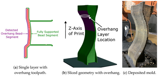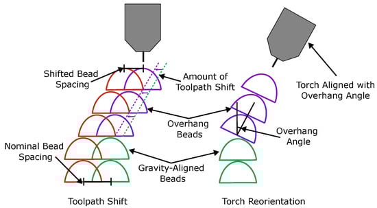 Overhang geometry occurs on perimeter insets where the centerline of the bead being deposited does not vertically align with the corresponding bead from the preceding layer. The angle between a line segment connecting the centerlines of these beads and the vertical axis determines the nominal overhang angle of an overhang bead segment. Similar to FDM additive manufacturing, the difficulty of depositing overhang bead segments increases noticeably with increasing overhang angles. When deposited with a gravity-aligned torch without compensation, overhang geometry can be subject to dripping at angles exceeding 15° due to gravitational effects on the unsupported melt pool [23]. However, compensation methods have been developed to enable the stable deposition of overhang geometry exceeding 90° via an adjustment of the welding torch during overhang deposition [24,25,26,27]. Overhang geometry may also be improved through the use of a multi-axis positioning table. However, these positioners are limited in their maximum payload and build volume. With torch compensation, shifting the toolpath of the outer perimeter towards the part center allows the melt pool to flow into the intended geometry and compensates for the gravitational forces exerted on the bead. Additionally, rotating the torch from its gravity-aligned position to match the angle of the overhang bead aligns the arc force of the welding process to assist in counteracting the gravitational forces.