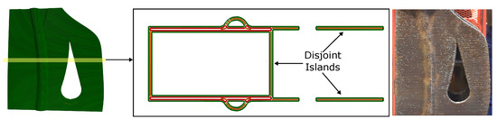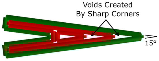 As corners within a sliced part become sharper, such as the 15° corner shown in Figure 11, triangle-shaped voids tend to appear due to the fundamental geometrical limitations of the inset generation method [28,29]. One can see that these gaps could also be filled with the skeletonization algorithm, but the short length of the skeleton beads and the triangular shape of the contour would result in the underfilling and overfilling of different segments of the void, thereby decreasing the geometrical accuracy of a sharp corner.