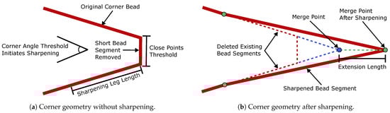 To mitigate this issue, a feature was implemented which enables the detection and compensation of these sharp corners. The corner-sharpening feature detects corners with angles below a specified threshold and extends the point where two beads intersect towards the adjacent bead, as shown in Figure 12. This feature allows for the extended beads to violate the overlap threshold specified for the inset generation to ensure that corners are accurately filled. Bead segments connecting the legs of the corner which are shorter than the defined close points threshold are eliminated. Then, the merge point is calculated by determining where the axes of the existing corner beads intersect. This point is extended along the axis bisecting the corner by the defined extension length to generate the intersection point for the sharpened geometry. Finally, the sharpened bead geometry is generated by connecting the intersection point for the sharpened geometry to the points on the original geometry determined by the defined sharpening leg length. The portion of the original beads along the sharpening leg length is deleted, which leaves a continuous toolpath containing the sharpened geometry.