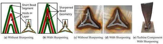 Figure 13 demonstrates the practical application of the corner-sharpening method with the slicing and deposition of a star-shaped object with multiple sharp corners. The sharpening feature was applied to the star-shaped object with a corner threshold of 33°, corner extension of 8 mm, leg length of 6 mm, and close points threshold of 7 mm. The physical validation was performed by depositing 410 SS wire with a nominal bead spacing of 4.5 mm, wire feed rate of 170 mm/s, and travel speed of 17 mm/s. Without the corner-sharpening feature enabled, there are clearly voids in the layer where the corners do not properly join. With the feature enabled, the layer is deposited without voids and without overfilling of that layer. The corner-sharpening feature is particularly applicable to ensuring the fully dense deposition of turbine blades, such as those similar to the component shown in Figure 13e, which was completed using this feature.