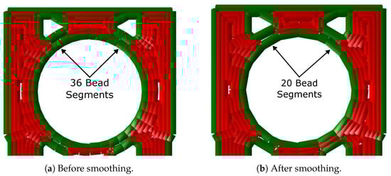 One versatile algorithm for smoothing is the Douglas–Peucker algorithm, which starts by generating a line segment between the first and last points of a bead [30]. Next, it computes the distance of each of the intermediate points within the bead to the line with the furthest point (with a distance larger than a specified threshold value) denoted as a key. This process occurs recursively between keys until each point on the original path line is within the threshold tolerance. The performance of this algorithm is illustrated in Figure 14, with the smoothed slice on the right containing fewer path points, especially within curved segments. The outcome of the smoothing operation is clearly visible within the green perimeter circles where the number of bead segments was reduced from 36 to 20 segments, which is a 47% reduction in path points, while the circular shape was maintained.