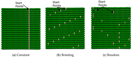 To this end, multiple solutions for controlling start point locations have been studied and tested utilizing various geometries. The first feature consists of methodologies for arranging start points in successive layers and includes three options, constant, rotating and random, as shown in Figure 15. Constant is the simplest method with start locations remaining in approximately the same relative location on successive layers. This feature is typically selected if a particular location on the external surface of the part is hidden or otherwise unimportant to the final geometry or strength of the part. The rotating method allows for the start point of the current layer to be set at some specified distance from the previous start point. In this method, the start point will travel a fixed distance around the boundary of the part with each successive layer. Finally, the random setting selects an arbitrary position for start points on every layer. This setting ensures some degree of distribution and is well suited to complex geometries where the length of the perimeter bead varies along the build axis. However, the random distribution can also lead to start points sometimes being grouped together in successive layers.