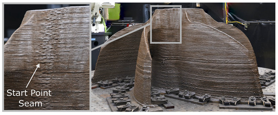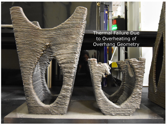 Managing thermal input is key to deposition in all metal additive processes. WAAM, in particular, is very sensitive to thermal conditions because of its high deposition rates and power input compared to other processes [36,37]. Most thermoplastics have low melting temperatures, i.e., ABS melts at ≈105 °C, while steel has a minimum melting point of ≈1350 °C. Unlike FDM deposition where the heat input is low and the bead cools to a steady state temperature, the heat input from WAAM deposition conducts through all of the prior layers of the part. Without downtime between layers, the increasing thermal mass means that beads take an increasingly long time to cool. This phenomenon can result in beads in the upper layers overheating, which may cause the melt pool to flow or drip before it has sufficiently solidified, as exemplified in Figure 20. The thermal sensitivity is also alloy-dependent, with most low-carbon steels having poor high-temperature stability and stainless steels exhibiting improved high-temperature stability [38]. In some cases, wait times between layers or temperature thresholds are sufficient to prevent overheating at the cost of increased print duration [39]. Additionally, some alloys are sensitive to thermal gradients within deposited material, and heating the part unevenly may induce thermal cracking. Therefore, WAAM slicing should account for inconsistent thermal inputs to balance the heat distributions in deposited components.