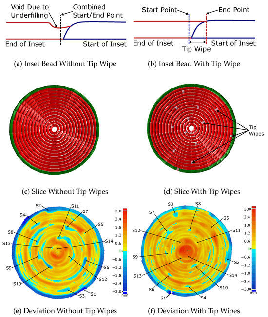 To demonstrate the effectiveness of tip wipes in improving the geometrical accuracy of a part, two circular layers composed of 14 insets were printed with the same process settings, one with tip wipes disabled and one with them enabled. Note that it is difficult to compare start points 1-to-1 in the experimental layers since the generated start points are not aligned between the compared layers, so averaged deviations across the layer were utilized instead. Deviation maps of the two slicing configurations are shown in Figure 17 with all 14 of the start point locations denoted. It is clear that, while some geometric variation is still visible after the addition of tip wipes, there is a clear reduction in the amount of deviation from the nominal layer surface. As recorded in Table 1, when tip wipes are enabled, there is a considerable decrease in the average maximum deviation for the start points and a significant improvement in the surface roughness as measured by the standard deviation of the exposed surface layer.