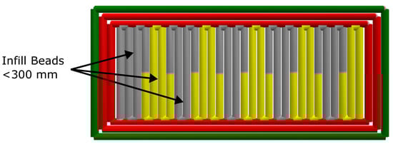 Demonstration of the maximum bead length parameter on infill bead with threshold of 300 mm. Alternating infill beads are highlighted to simplify identification.