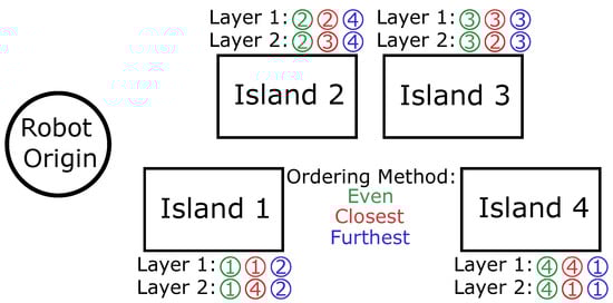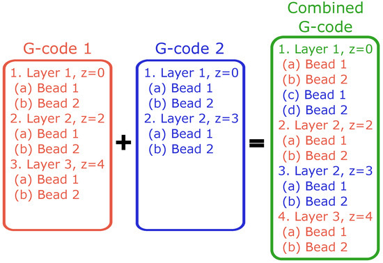 While the intent of the slicing process is to generate the complete G-code for a given part or parts without additional operations, there may be some cases where the multiple G-code files must be joined to print multiple parts simultaneously or to combine different portions of a complex geometry. Printing multiple parts simultaneously increases productivity by reducing setup times while also allowing additional cooling time for parts that are sensitive to thermal input. To fulfill the need to combine G-code, a splicing tool can be incorporated into the slicing environment, which automatically combines any number of previously generated G-code files into a single file. Layers with matching vertical positions are merged to allow for simultaneous printing, and the remaining layers with differing vertical positions are sequenced in an order corresponding to their heights, as highlighted in Figure 26. While multiple parts can be sliced together within the slicing environment, splicing G-code is critical when the user may not have access to the original CAD files utilized in generating the separate G-code files. In addition to printing multiple parts simultaneously, this feature enables the user to merge multiple slices corresponding to different segments of a single geometry. This capability allows the user to divide a geometry within CAD software when finer control of the slicing is required and then combine the sliced segments into a single G-code file. In particular, this need arises with parts where multiple materials are unevenly distributed within the layers, limiting the applicability of the aforementioned multi-material bead assignment.
