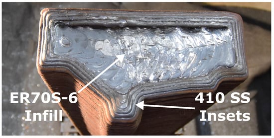 A key advantage of WAAM over traditional methods of manufacturing metals is its ability to leverage multiple materials deposited within a solid geometry [40,41,42,43,44]. One application of multi-material deposition is to reduce costs by introducing less expensive materials in non-critical areas of the part. However, using multiple materials also enables enhanced productivity when one material can be more rapidly deposited than another one. An example of this flexibility is shown in Figure 23, where the structural inset beads are composed of 410 SS, with the remaining internal geometry being filled by ER70S-6 infill beads.