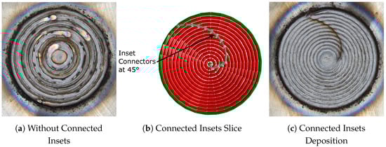 Comparison of similar layers deposited without and with connected insets, and illustration of inset connectors within the generated slice.