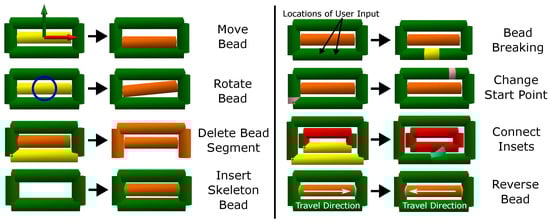 While the majority of slicing and toolpath generation should be automated according to the selected parameters, any remaining compensation can be manually implemented as a last resort through a suitable UI interface within the slicing environment using tools such as the ones shown in Figure 27. The move and rotate bead features allow for the relocation or reorientation of beads to ensure that beads are located in the optimal location for deposition. If a few segments of a bead are shifted, the slicing engine will attempt to adjust the connected bead segments to ensure that the toolpath remains continuous. The delete bead tool allows for the deletion of any beads or bead segments which are extraneous and automatically turns insets with deleted segments into skeleton beads. The insert bead tool attempts to insert a skeleton bead at the user-specified location. The break beads feature allows the user to break a bead segment into two shorter bead segments, and the slicing engine adjusts the G-code accordingly. Used in combination with the delete bead segment feature, the bead-breaking feature allows the user to precisely trim away any portion of a larger bead.