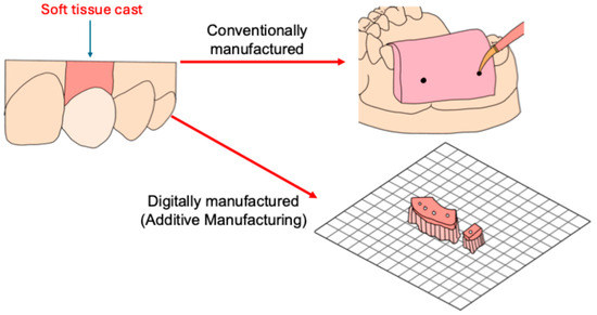 Dental implants differ from natural teeth in size, shape, and attachment to bone and soft tissue, which presents a significant challenge for quality production [9]. More specifically, at the gingival level, implants do not accurately replicate the cross-section of natural teeth in shape or size, typically having a significantly lower cervical width of the restoration. Overcoming this hurdle exists in the usage of a soft tissue cast, which gives a clear vision of the gingival margin and thickness of the gingiva and provides a medium for accurate contouring of the emergence profile [5,10], as shown in Figure 1. A trend in implant dentistry is the expanding usage of digital technology. The advancements in treatment planning software and computer-aided design (CAD) and computer-assisted manufacturing (CAM) technology have simplified and improved the workflow of digital implant treatment and fixed prosthodontics [11]. The fabrication of a soft tissue cast using the conventional method significantly differs from additive manufacturing, also known as the 3D-printing method. It is crucial that materials used for soft tissue casts have the following properties: dimensional stability for the duration of the prosthesis fabrication period; ease of fabrication as well as durability during use by having adequate flow, tensile tear strength, and resilience; compatibility and nonadherence to the impression material, and ability to be removed from the underlying stone; and to be shaped and modified if necessary [5].