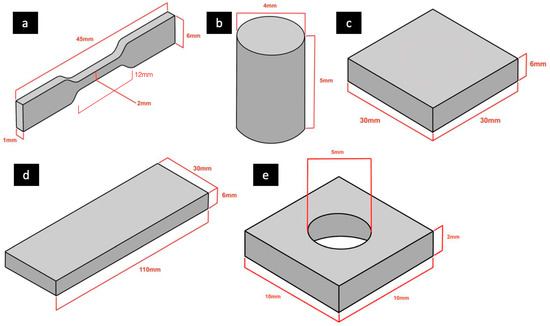 Figure 2 shows the measurements of each specimen fabricated in this study. The geometry of the tensile specimens is Type 1a according to EN ISO 527-1:2019. Compression specimens are illustrated in Figure 2b. Shore A hardness specimens were designed to the dimensions shown in Figure 2c,d. The Shore A hardness specimens followed recommendations by Hoto Instruments that the minimum specimen dimensions must be 44 mm long, 19 mm wide, and 6 mm thick. We chose a square shape for our accuracy specimens, with the hole in the middle (Figure 2e) being of similar dimensions to that of an average implant. The overall size of the specimen was similar to the typical size of a soft tissue cast required for a molar. A sample size calculation for mechanical testing was performed based on a previously conducted experiment of similar nature and outcomes using the software G*power v3.0.10 (Heinrich-Heine Universität, Düsseldorf, Germany). The effect size (dz = 4.9706) and the required sample size were calculated for α = 0.05 and a power of 0.95 (1-β err prob), assuming a normal distribution. The calculation shows that a minimum of n = 20 per material group for tensile strength testing, n = 20 per material group for compressive strength testing, and n = 10 each per material group for Shore A hardness testing and accuracy analysis were required.