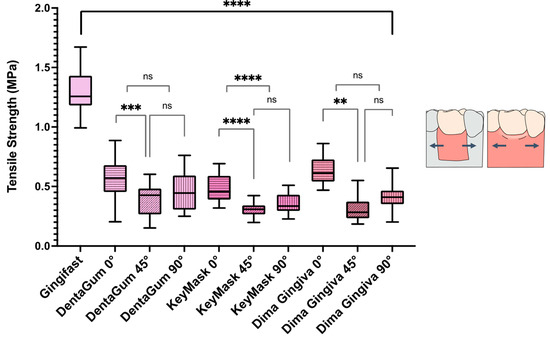 Comparison of tensile strength (MPa) between conventional (Gingifast) material and three AMed printed materials (DentaGum, KeyMask, and Dima Gingiva) with build angles 0°, 45°, and 90°. Note: ns; not significant, ** statistically significant with values p < 0.05, *** statistically significant with values p < 0.01, **** very statistically significant with values p < 0.001. Blue arrows in the figure on the right indicate the direction of tensile force on the material.