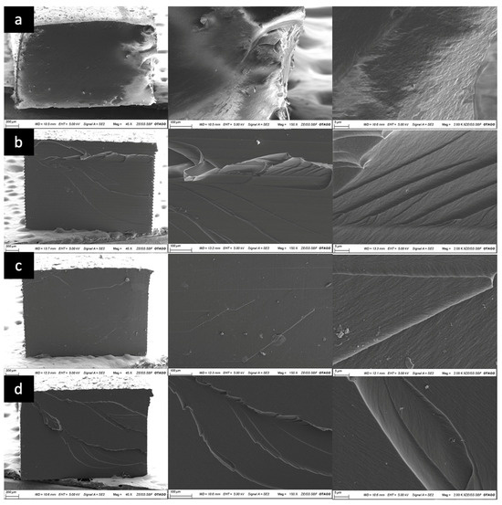 SEM images showing the fracture surfaces of tensile specimens: (a) Gingifast, (b) DentaGum, (c) KeyMask, (d) Dima Gingiva.
