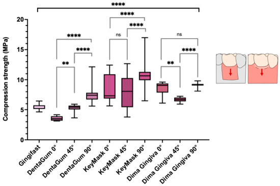 Comparison of compression strength (MPa) between conventional (Gingifast) material and three AMed printed materials (DentaGum, KeyMask, and Dima Gingiva) with build angles 0°, 45°, and 90°. Note: ns; not significant, ** statistically significant with values p < 0.05, **** very statistically significant with values p < 0.001. Red arrows in the figure on the right indicate the direction of compressive force on the material.
