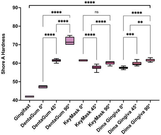 Comparison of Shore A hardness (HA) between conventional (Gingifast) material and three AMed printed materials (DentaGum, KeyMask, and Dima Gingiva) with build angles 0°, 45°, and 90°. Note: ns; not significant, ** statistically significant with values p < 0.05, *** statistically significant with values p < 0.01, **** very statistically significant with values p < 0.001.