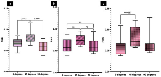 Graphs showing the accuracy of additively manufactured soft tissues printed at different angles; (a) DentaGUM (b) KeyMask (c) Dima Gingiva. Note: ns; not significant.