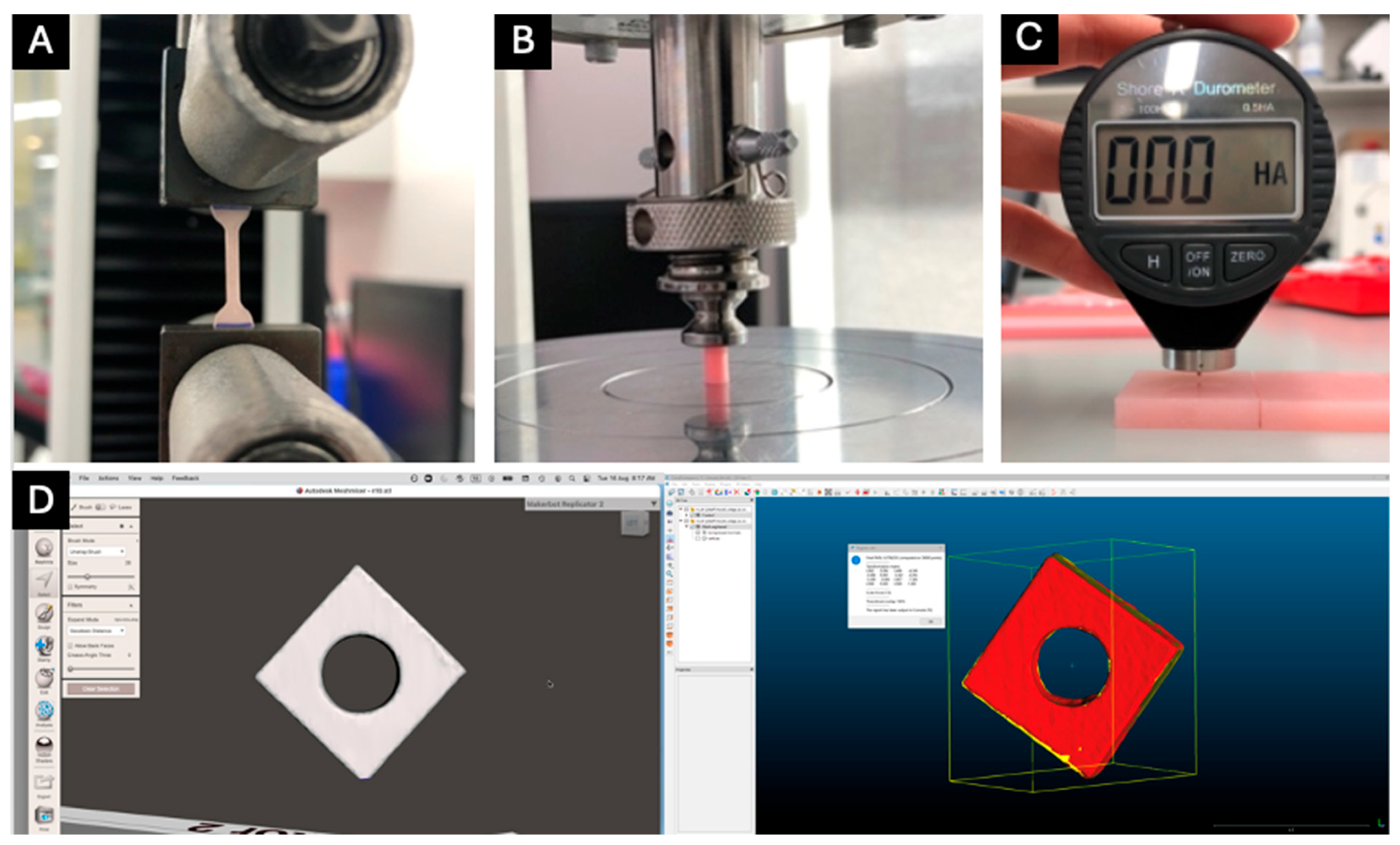 Images showing the testing setups: (A) tensile, (B) flexural, (C) shore hardness testing, and (D) accuracy analysis.