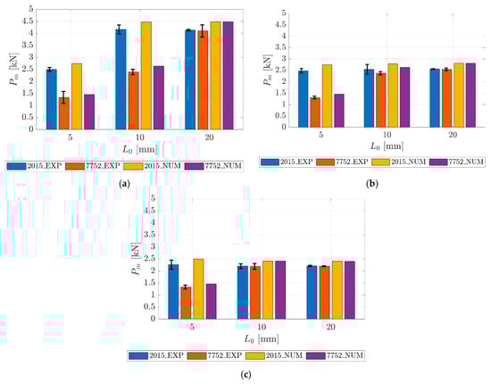 - In the joints with PLA and Araldite® 2015, Pm increases by 66.5% for LO = 5–10 mm, as a result of different types of failure, including cohesive and adherend failures, respectively. For LO = 10–20 mm, the same failure was obtained, and no increase is noted. However, using Sikaforce® 7752, Pm increased to 79.0% and 71.4% for LO = 5–10 mm and LO = 10–20 mm, respectively, as cohesive failures were always obtained. Comparing both adhesives with LO = 5 mm, the SJs with Araldite® 2015 were 87.0% more resistant than those with Sikaforce® 7752. The same fact is obtained for LO = 10 and 20 mm, with Araldite® 2015 being more resistant by 74.0% and 0.8%. The minor percentile difference for LO = 20 mm is related to the adhesive’s mechanical properties, such as stiffness, strength, and ductility. For higher LO, Sikaforce® 7752 increases its load capacity as it is a more flexible and ductile adhesive than Araldite® 2015, which is stiffer and more brittle.