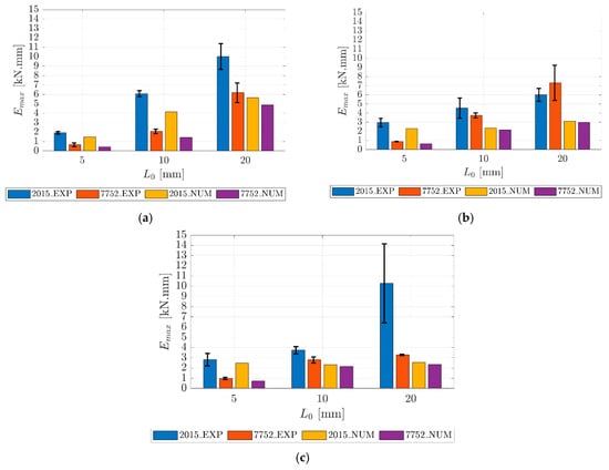 - In the joints with PLA and Araldite® 2015 adhesive, an increase in Emax of 214.8% is observed between LO = 5 and 10 mm and 64.9% between LO = 10 and 20 mm. For LO = 5 mm, the rupture occurred in the adhesive with a Pmax relatively lower than that obtained with LO =10 mm where the rupture occurred in the adherend. Between LO = 10 and 20 mm, the increase is significantly reduced due to the fracture that occurs in the adherend, resulting in a similar Pmax. However, with LO = 20 mm, there is a slight plasticisation of the adherend prior to rupture, which causes the displacements at rupture to be higher with LO = 20 mm. Thus, a higher Emax is obtained as well. For the Sikaforce® 7752 adhesive, the fractures always occurs in the adhesive, which means that there is not much difference in the increase in Emax between the different LO values. Between LO = 5 and 10 mm, Emax increased by 220.0%. Between LO = 10 and 20 mm, it increased by 197.4%. With the PLA adhesive, the Araldite® 2015 adhesive shows a higher Emax than the Sikaforce® 7752 adhesive with increases of 197.3%, 192.4%, and 62.1% for LO = 5, 10, and 20 mm, respectively. These differences are due to the failures in the adhesive with Sikaforce® 7752, which resulted in Pmax values that were relatively lower than those obtained with the Araldite® 2015 adhesive.