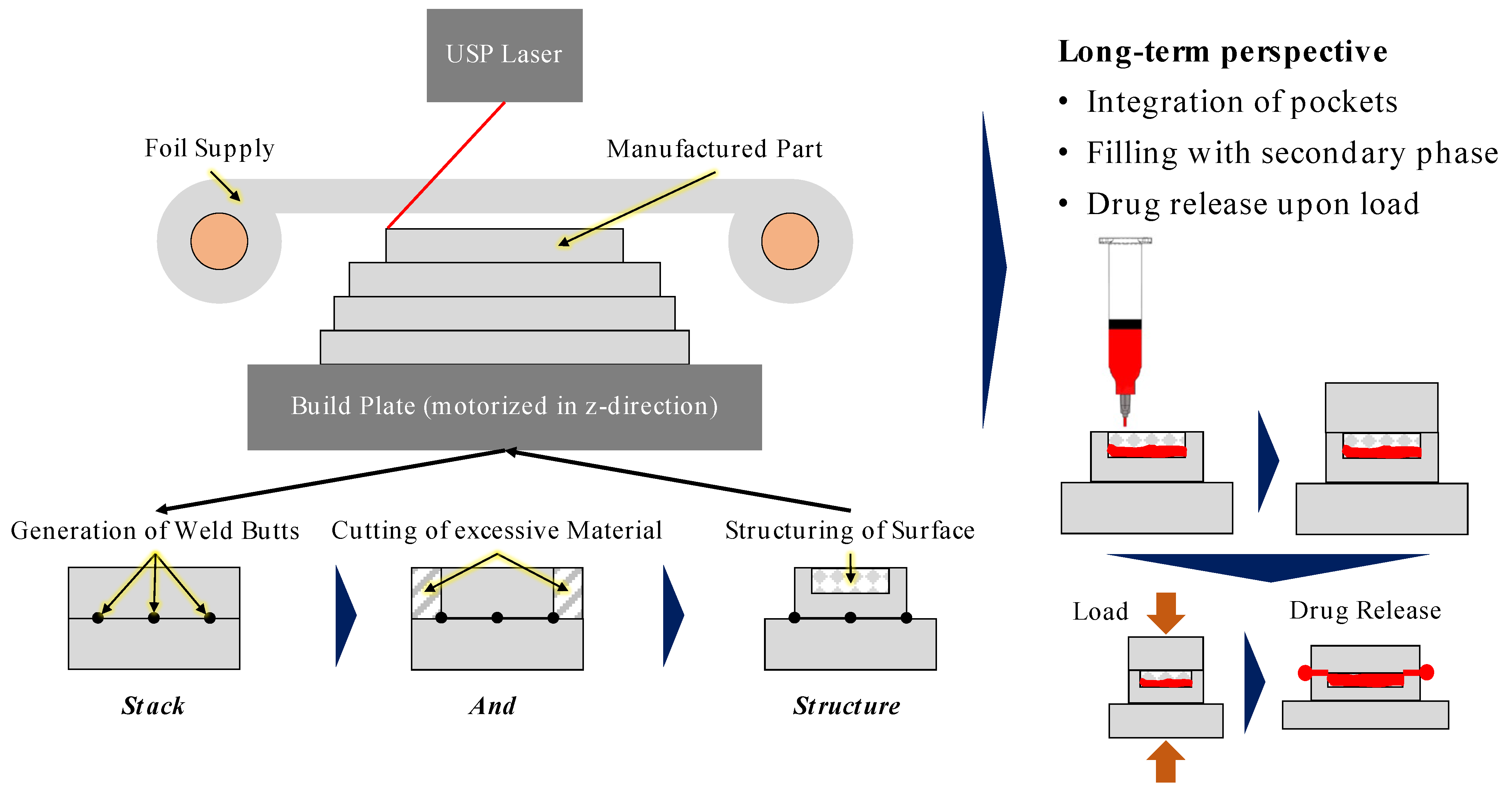In the next step, the second (or n-th) layer is applied to the previous film or part. The average layer thickness can be varied by selecting the thickness of the films. In this way, either the build rate (thick films) or the dimensional accuracy (thin films) of the manufacturing process can be improved. The ultrafast laser is then used for joining the two films with each other at specific positions. By using an ultrafast laser, the heat input into the material during welding can be minimized. This minimal heat input, often referred to as “cold” processing, opens the possibility of maintaining the properties, e.g., anisotropic properties, of the base material. When aiming at generating media-dense parts, a complete welding around the edges of the final geometry is necessary. In this instance, the energy input via the USP laser needs to be controlled to generate a molten state for a connection between the two materials.