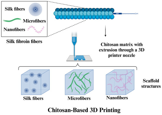 Chitosan, a biopolymer made from chitin by alkaline deacetylation, is a promising material for 3D bioprinting and has garnered attention due to its biocompatibility, biodegradability, non-toxicity, and ability to form hydrogels [58]. The unique rheological characteristics of chitosan make it ideal for use in 3D bioprinting for tissue engineering and regenerative medicine, enabling the production of complex and accurately defined tissue scaffolds [59,60]. Zhang et al. combined silk microfibers, nanoparticles, and nanofibers to generate chitosan/silk composite scaffolds (Figure 1) using an extrusion-based 3D printing technique. The hydrophilic surface of the produced scaffolds promotes stable cell growth. The geometry of the silk nanoparticles had a significant impact on the mechanical capabilities, and the scaffolds that were 3D-printed and packed with silk nanofibers showed the longest shape and the fastest rate of fibroblast growth [61].
