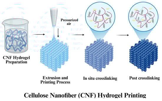Cellulose is a β-1,4-linked glucopyranoside polymer that is renewable, biodegradable, safe for the environment, and compatible with living things [62]. It can also be covalently connected to a variety of bioactive substances. Cellulose can be used in 3D bioprinting to create cell-rich structures that mimic the ECM found in nature. The study found that cellulose nanofibers (CNFs) are perfect for bioprinting because of their shear-thinning properties [63]. This guarantees that the printed item maintains its structural integrity and facilitates extrusion processes (Figure 2). Nanocellulose increases the rheological properties of bioinks, improving both printability and cellular interactions [64]. Furthermore, studies have shown that cellulose-based bioinks may support many cell types, ensuring sufficient cell activity and multiplication even after printing [64]. Additionally, by altering the physical and chemical characteristics of cellulose through various formulations, researchers have been able to change how the material behaves for specific bioprinting applications [65,66]. This enables them to modify materials to achieve the required bioactivity and mechanical properties.