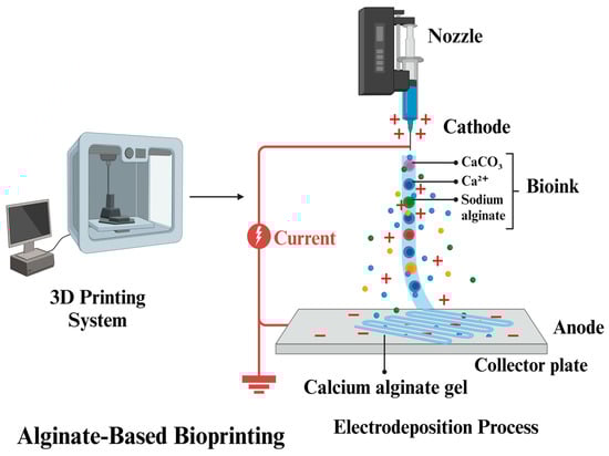 Alginate, a naturally occurring polysaccharide derived from brown algae, is one of the most crucial components in 3D bioprinting [67]. It is hydrophilic, biocompatible, biodegradable, and non-toxic. Alginate bioinks may be made more printable by varying their alginate content or mixing them with other polymers like gelatin or nanocellulose [68]. For instance, methylcellulose and alginate together improve the shape fidelity of bioprinted structures, allowing for the progressive dynamic release of components and mechanical stability. Shang et al. proposed a calcium alginate hydrogel fabrication method that combines electrodeposition and 3D printing [69]. Sodium alginate and CaCO3 nanoparticles were sprayed onto a conductive substrate through the injector nozzle as fillers, and the calcium alginate hydrogel was created by the release of Ca2+ ions from the CaCO3 particles under electric pressure, which caused the alginate to cross-link (Figure 3) [70]. The injection syringe was connected to a conventional 3D printer.