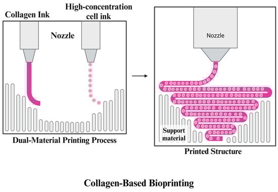 Collagen is regarded as an essential biomaterial in the field of 3D bioprinting because of its abundance in nature and proximity to the ECM found in live organisms [71]. Surprisingly, collagen is easily adaptable to many bioprinting methods. Because the bioink gels at body temperature, it may be utilized to produce intricate 3D structures that resemble genuine tissues. Jeong et al. showed that 3D-printed collagen scaffolds could effectively maintain the physiological parameters necessary for cryopreserved melanoma explants, emphasizing the significance of collagen in mimicking in vivo conditions in vitro [72]. A recent study by Lee et al. used a dual-material printing technique to create an elliptical left ventricular model. Collagen bioink was used to reinforce the outside and interior walls to maintain their intended geometric shape and provide adequate structural support (Figure 4) [73]. Directional action potential transmission and coordinated contraction were made possible by the central core area in conjunction with high-density cell bioink (such as cardiac muscle cells derived from human stem cells).
