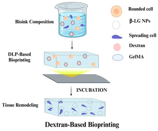 Dextran, a naturally occurring polymer created when bacteria ferment sucrose, is a crucial part of 3D bioprinting due to its biodegradability, versatility in physicochemical properties, and favorable biocompatibility [74]. When added to cross-linked hydrogel formulations, dextran enhances the bioink’s printability, swelling behavior, and overall mechanical strength, particularly when paired with other polysaccharides like hyaluronic acid. Pescosolido et al. revealed the idea of mixing dextran and hyaluronic acid to increase the structural stability of semi-interpenetrating networks [75]. Tao et al. combined GelMA solution with β-lactoglobulin (β-LG) nanoparticles/dextran solution mixture to prepare bioinks and print tissue structures using 3D bioprinting technology based on digital light processing (DLP) (Figure 5) [76]. After solidifying, the ink was submerged in the culture media to form in situ pores that allow nutrients and oxygen to enter the 3D-printed hydrogel structure.