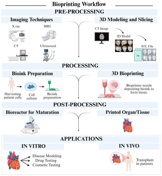 Recently, 3D printing technology has advanced significantly, enabling the production of complex tissue structures. The use of biocompatible polymers holds potential for transforming tissue engineering and regenerative medicine [91,97]. The 3D bioprinting process consists of several crucial components, which can be broadly divided into three main phases: preprocessing, which involves creating the digital 3D model to be printed; processing, which includes preparing the bioink and printing the model; postprocessing, which focuses on stabilizing and maturing the bioprinted structure (Figure 6) [98].