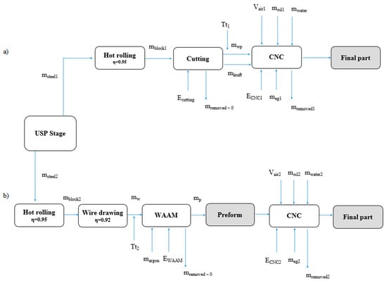 Figure 2 shows a diagram providing a visual representation of the different stages involved in the two manufacturing routes under study: the traditional based on subtractive manufacturing, in Figure 2a, and the proposed hybrid (additive–subtractive) manufacturing (WAAM-CNC), as shown in Figure 2b. The upstream steel production (USP) stage encompasses all the processes required to obtain the steel mass before it enters any specific downstream processing route. It includes raw material extraction, transportation, and primary steelmaking. The resulting steel mass (msteel1,2) serves as the input material for the subsequent differentiated processing routes analyzed in this study. Both routes produce an identical final part of PCSB and were carried out in the same workplace, the Smart Manufacturing Lab at the University of Cádiz UCA-SEA Innovation Center, located in Algeciras, Spain.