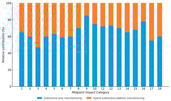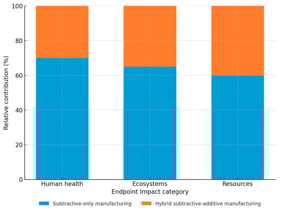 Figure 3 graphically compares the relative contribution of each manufacturing process to three endpoint categories: human health, ecosystems, and resources. The 100% stacked column chart shows that, across all categories, the hybrid subtractive–additive manufacturing process consistently exhibits a lower relative environmental impact than subtractive-only manufacturing. The most notable difference appears in the human health category, which is the most heavily weighted in the ReCiPe method. These visual results reinforce the numerical findings in Table 3 and Table 4, exhibiting the environmental benefits of transitioning to a hybrid manufacturing strategy.